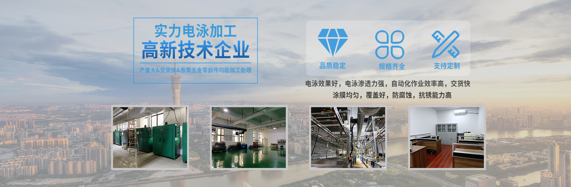 本公司創(chuàng)始于2004年,由專業的涂料技術專家及應用技術工程師發(fā)起并組建的高新技術企業,專業從事各類金屬電泳涂裝,是專業的電泳涂料、電泳加工及配套設備供應的高科技公司。 本公司依托多年從事電泳的經驗技術,對多種材料(銅、鋁、鐵、不銹鋼、鋅合金、鋁合金等材料)表面處理的研究,采用先進的工藝與進口原料的配合,完全可以保證客戶產品的表面涂裝,能達到出口產品的標準要求。主要電泳白色、透明、黑色和紅色、藍色、黃色、紫色等多種彩色。 憑著先進的電泳技術和嚴格的品質要求,本著以最高的客戶滿意度為目標,這幾年時間,我們已得到了精密電子五金、衛...